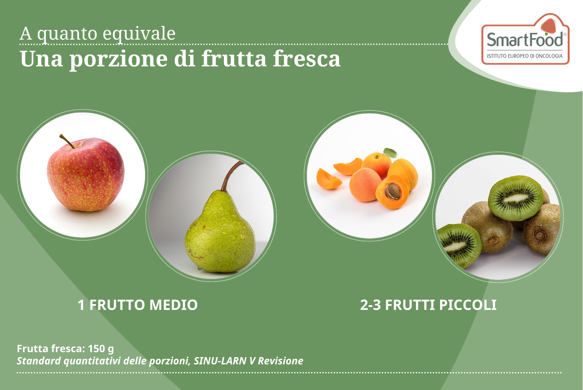 Ad esempio la porzione di frutta pari a 150 g corrisponde ad 1 frutto medio o 2-3 frutti piccoli.