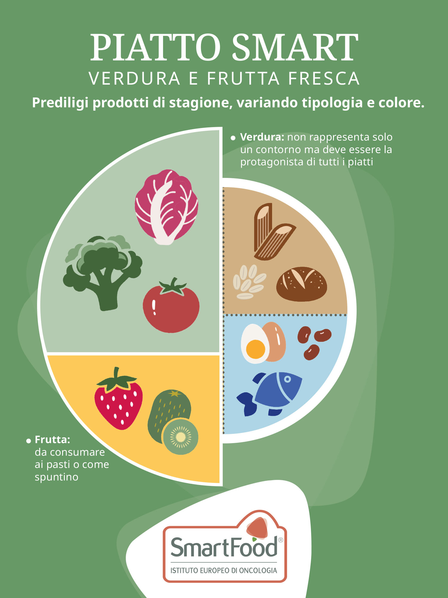 Un altro messaggio importante del piatto sano è variare il più possibile gli alimenti, in particolare frutta e verdura (in armonia con la stagionalità). Variare, infatti, consente di fare scorta delle diverse tipologie di nutrienti presenti nei vari alimenti. Nel caso particolare dei vegetali, ogni tipologia contiene differenti tipi di micronutrienti, e fitocomposti. Questi ultimi comprendono una grande varietà di sostanze, con la caratteristica comune di modulare numerose attività biologiche e importanti funzioni dell’organismo. I fitocomposti spesso sono i pigmenti responsabili dei colori di buccia e polpa di frutta e verdura. Per questo, un trucco smart per approvvigionarsi di un ampio ventaglio di nutrienti è diversificare il più possibile frutta e verdura in base al colore.