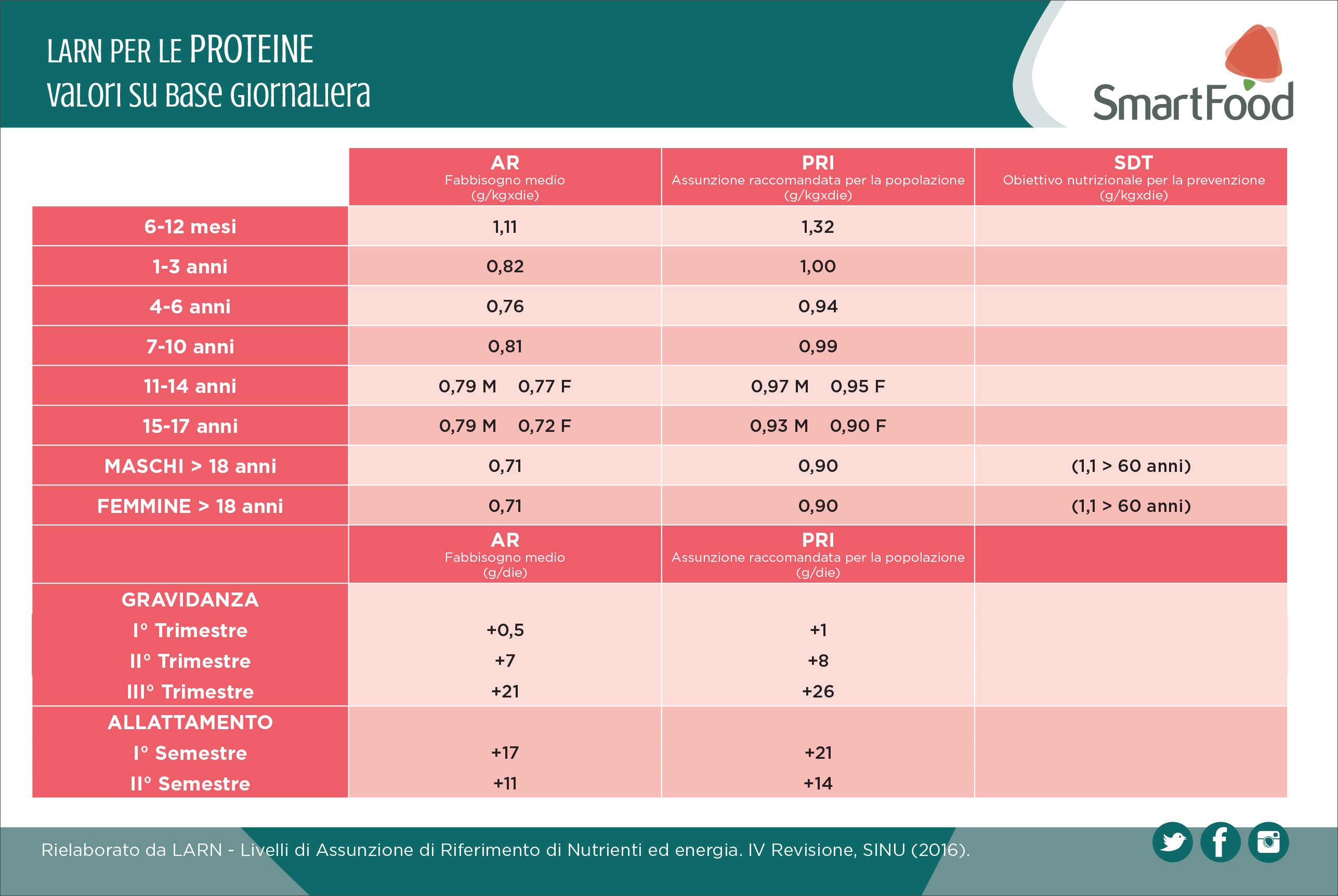 I LARN affermano che, tenendo conto sia delle indicazioni per una sana alimentazione sia degli intervalli di riferimento per l’assunzione di carboidrati e lipidi, apporti proteici ragionevoli sono pari al 12-20% dell’energia totale della dieta (con prevalenza di alimenti di origine vegetale) dopo i primi due anni di vita. Mentre, fino ai due anni di età si ritiene prudente un’assunzione non superiore al 15% dell’energia, poiché apporti maggiori potrebbero associarsi a sovrappeso/obesità in età evolutiva, con conseguenze negative a medio-lungo termine sullo stato di salute.