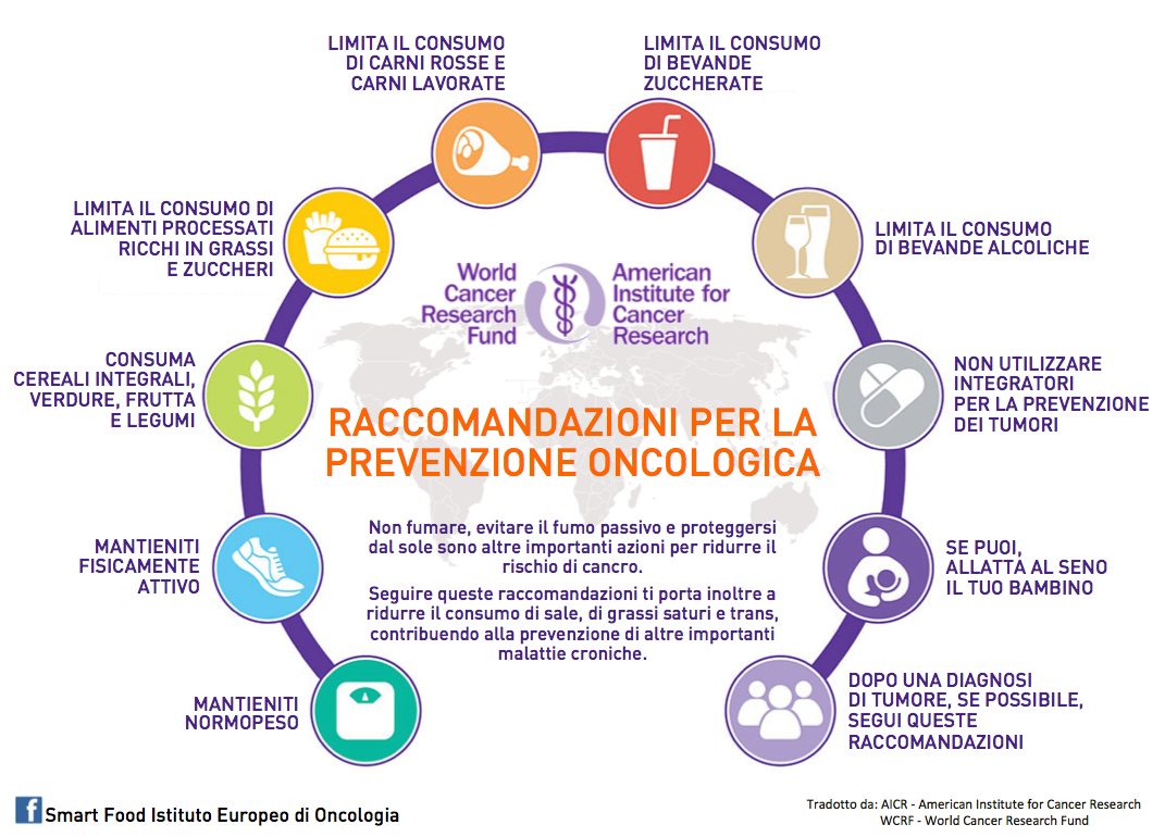 Ricordiamo, che non esiste alcuna dieta anti-cancro, in assenza di problematiche particolari o di sintomi specifici, oppure di un’indicazione dell’oncologo ad escludere determinati cibi che potrebbero interferire con le terapie, non c’è ragione di eliminare alcun alimento. Anche chi ha ricevuto una diagnosi di tumore, se non diversamente consigliato dal personale medico, può continuare a seguire un modello di alimentazione di tipo mediterraneo, tenendo presenti le raccomandazioni del WCRF per la prevenzione oncologica.