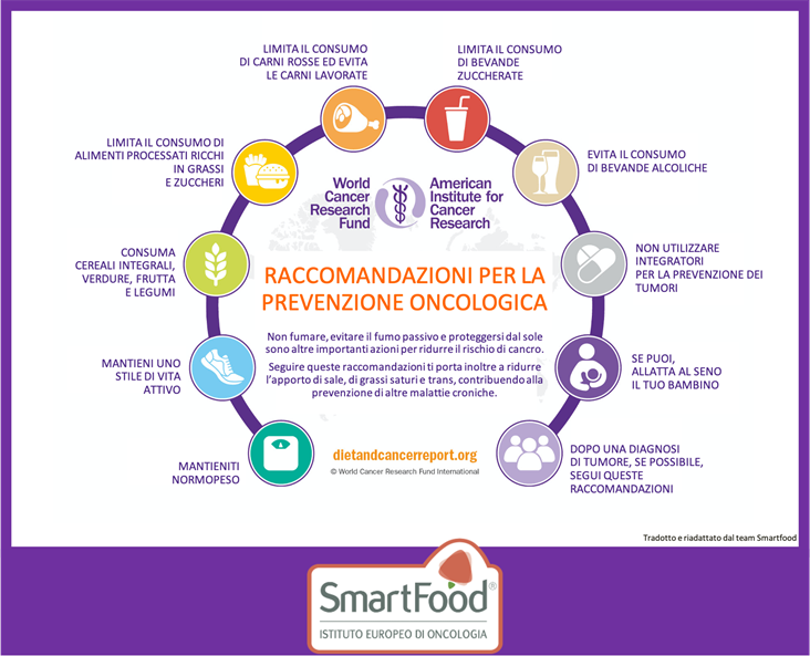 Mantenersi in normo peso e fisicamente attivi rappresentano le principali indicazioni per ridurre il rischio di malattie oncologiche. Gli esperti del Fondo Mondiale per la Ricerca sul Cancro hanno raccolto le ultime evidenze in ambito di nutrizione e sviluppo di patologie tumorali e stilato le dieci raccomandazioni per la prevenzione delle malattie oncologiche.