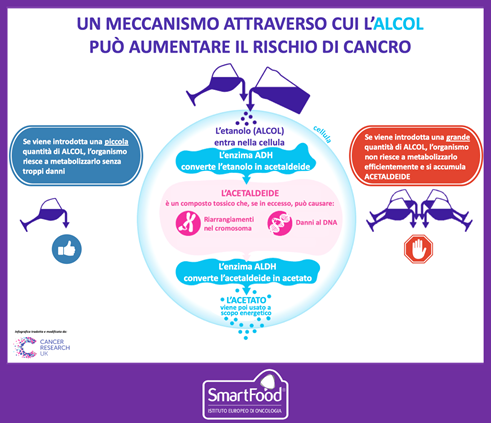 Sebbene le bevande alcoliche possano contenere diversi composti potenzialmente cancerogeni, le evidenze si basano soprattutto sul ruolo dell’alcol (etanolo) e del suo metabolita, l’acetaldeide. Il metabolismo dell’alcol avviene principalmente nel fegato, ma anche nel tessuto mammario.