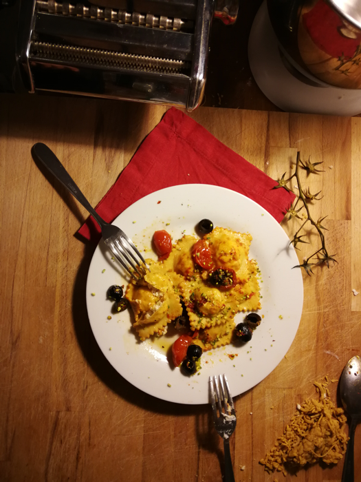 - Finire la cottura dei ravioli nella crema di zucca (se necessario aggiungere acqua di cottura).