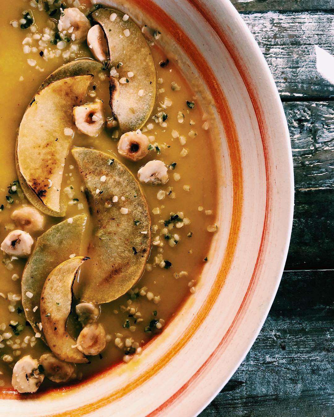 - Aggiustare con spezie (curry o peperoncino), un po’ di gomasio, servire in una ciotola e guarnire con i semi tostati.