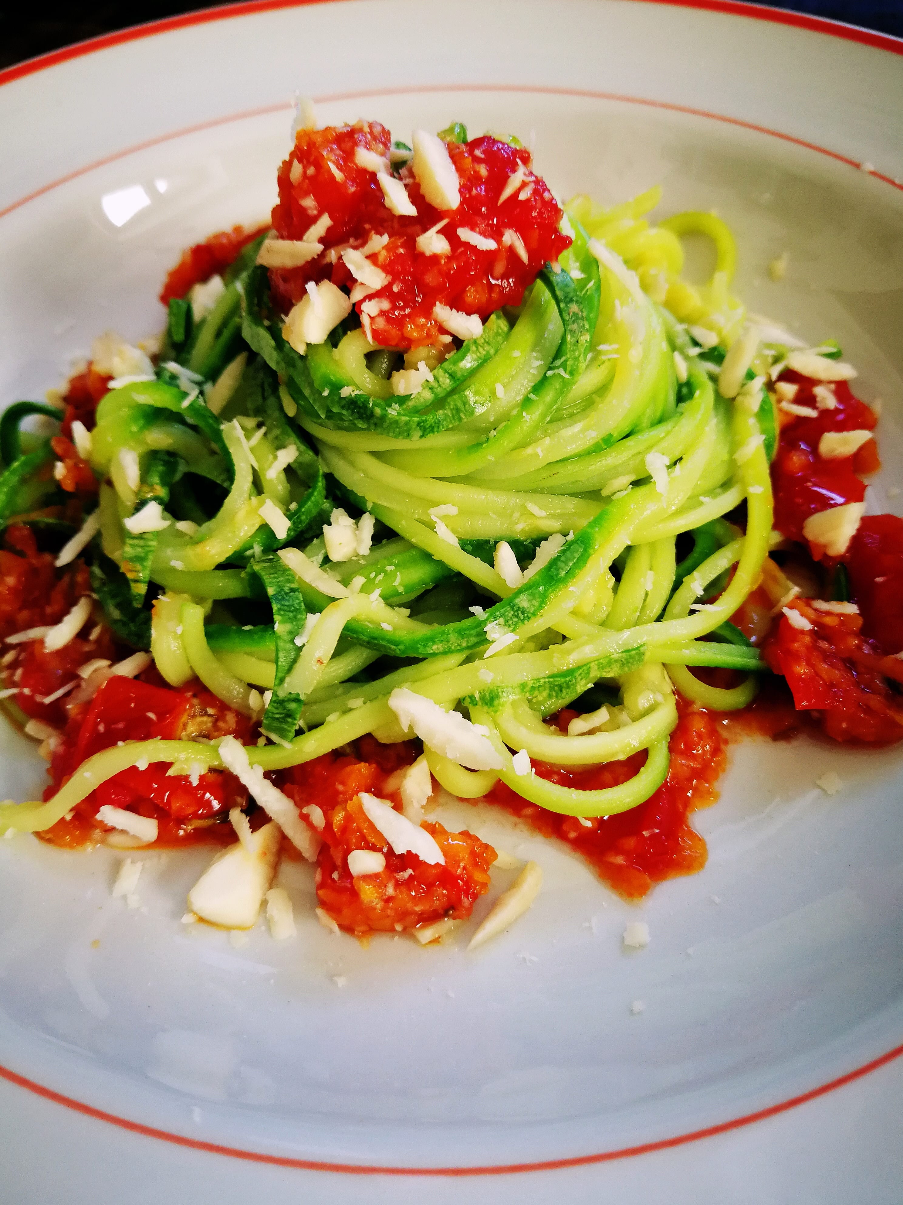 2. Temperare le zucchine per trasformale in spaghetti, per farlo è possibile utilizzare un accessorio per il taglio à la julienne o uno spiralizzatore. Tenerle da parte.