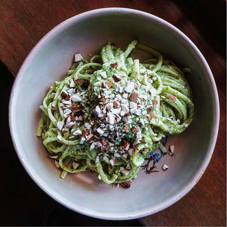 Una ricetta perfetta per i celiaci, essendo gli spaghetti a base di farina di riso, cereale privo di glutine. Per completare il pasto, secondo le regole del piatto smart, è necessario associare una fonte proteica, come una porzione di legumi o di pesce, e un frutto di stagione. La porzione di verdure è presente nel condimento, che regala anche preziosi grassi buoni, grazie all’uso dei semi, tuttavia, se gradito, è possibile accompagnare il tutto, anche con della verdura fresca.
